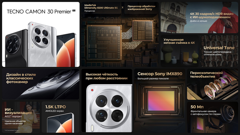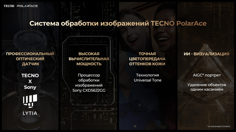 O Tecno PolarAce aproveita o poder do processador de imagem de ponto flutuante Sony CXD5622GG, dos sensores de imagem Sony Lytia, da tecnologia de imagem multi-pele Tecno Universal Tone e das mais recentes tecnologias de imagem de IA da Tecno.