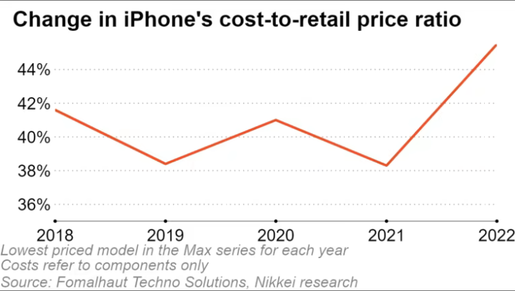 A Nikkei desmontou o antigo iPhone 14 Pro e calculou que o custo dos componentes nos novos smartphones da Apple aumentou cerca de 20% em relação aos modelos da geração anterior. Os custos de produção da empresa americana subiram para níveis recordes, o que provavelmente indica uma queda na lucratividade, já que a Apple não aumentou os preços dos novos iPhones nos EUA e em vários outros países.
