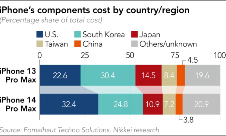 Os componentes para o iPhone 14 são fornecidos principalmente por empresas norte-americanas, que respondem por 32,4% dos componentes, cujo custo aumentou cerca de 10% em relação ao ano passado. A participação dos fornecedores sul-coreanos caiu para 24,8%. A Apple terceirizou grande parte de sua produção de iPhone para a China, mas em meio a tensões entre a China e os EUA, a empresa está diversificando a produção para outros países, como a Índia. Revisitar as cadeias de suprimentos de eletrônicos e outros componentes pode mudar a estratégia da Apple daqui para frente.