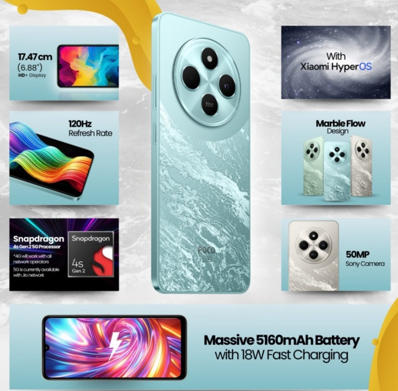 Ao mesmo tempo, o fabricante anunciou o smartphone econômico Poco C75 5G. Possui uma tela LCD de 6,88 polegadas que suporta resolução HD + e taxa de atualização de 120 Hz. Há uma câmera frontal de 5 megapixels colocada em um recorte em forma de gota d’água na parte superior da tela. A câmera principal é construída em um sensor de 50 megapixels da Sony e suporta gravação de vídeo 1080p a até 30 quadros por segundo.