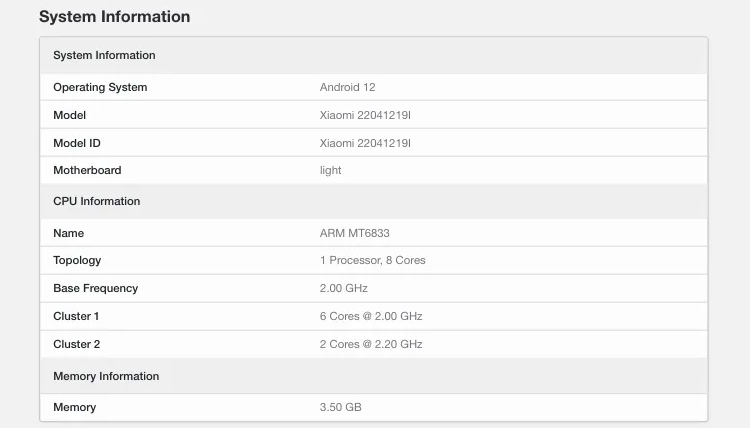 A novidade tem a designação do código 22041219i. O teste fala sobre o uso do processador MediaTek MT6833, mais conhecido como Dimensity 700. O chip combina oito núcleos com frequência de até 2,2 GHz, um acelerador gráfico Mali-G57 MC2 e um modem 5G.