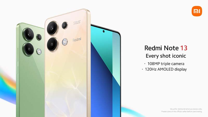 A bateria de 5.000 mAh suporta carregamento rápido de 33 W. A alta qualidade de som é fornecida por dois alto-falantes com suporte à tecnologia Dolby Atmos. Há também um conector de áudio de 3,5 mm para fones de ouvido. Um sensor de impressão digital sob a tela é usado para desbloquear. O smartphone é protegido contra poeira e umidade de acordo com o padrão IP54. MIUI 14 baseado em Android é usado para controlar o dispositivo. Redmi Note 13 está disponível em Midnight Black, Mint Green, Ice Blue e Ocean Sunset.