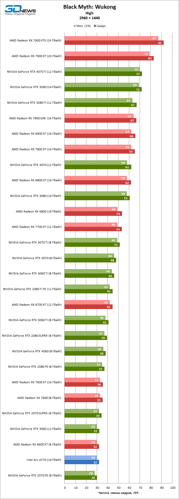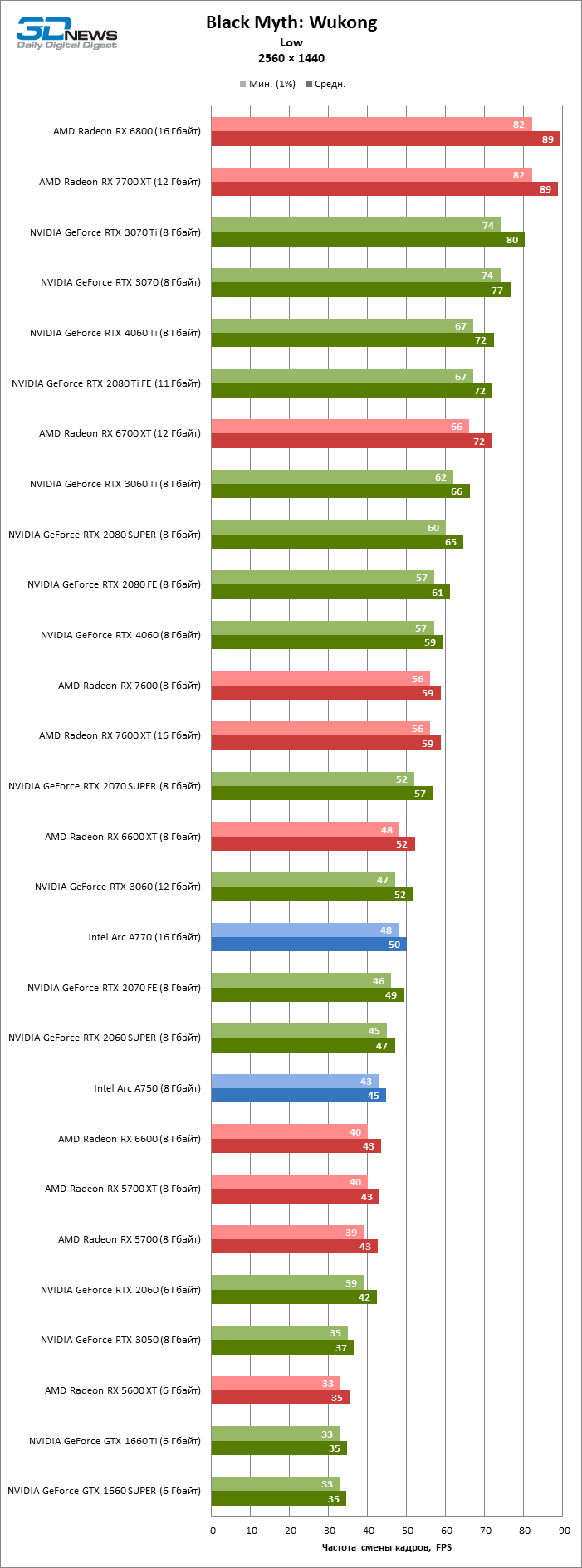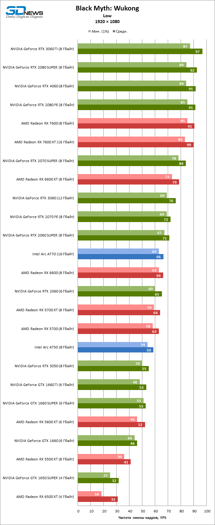 Por fim, com baixa qualidade de imagem, modelos baratos das gerações atual (GeForce RTX 4060 e Radeon RX 7600 XT) e anteriores (GeForce RTX 3060 e Radeon RX 6600), juntamente com a Radeon RX 5700 e a versão básica da GeForce RTX 2060 , atingiu uma taxa de quadros confortável a 60 FPS, a principal placa de vídeo da Intel, a Arc A770, foi finalmente lançada. Embora Black Myth: Wukong seja um jogo extremamente exigente em velocidade máxima, no modo “batata” o detalhe é reduzido tanto que placas de vídeo de baixo consumo de energia como a Radeon RX 5500 XT, Radeon RX 6500 XT e GeForce RTX 1650 SUPER atingiram a marca de 30 FPS. Os resultados da GeForce RTX 3050 e Intel Arc A750 tendem a 60 FPS, mas não ultrapassam a marca crítica.