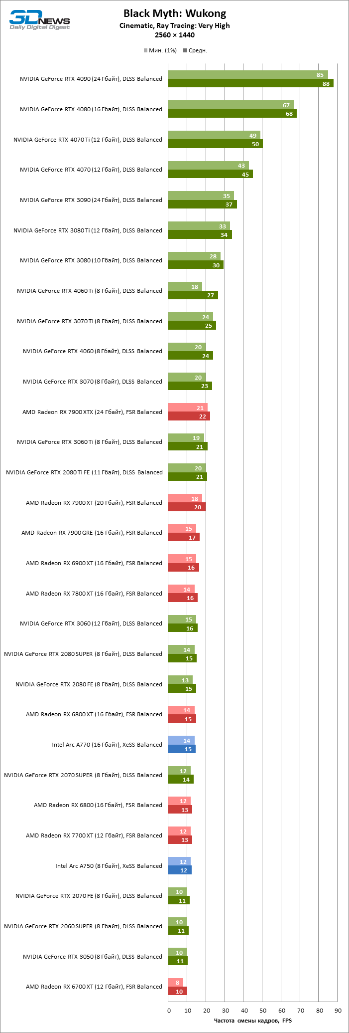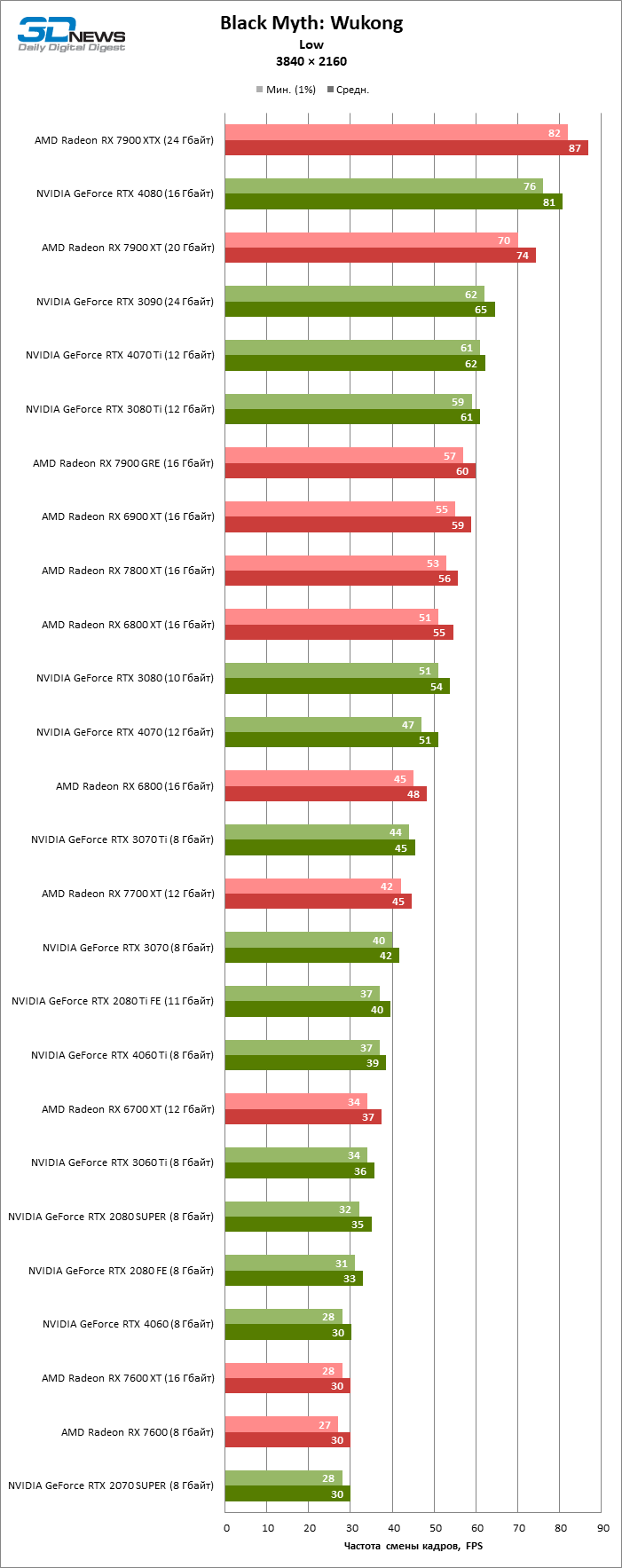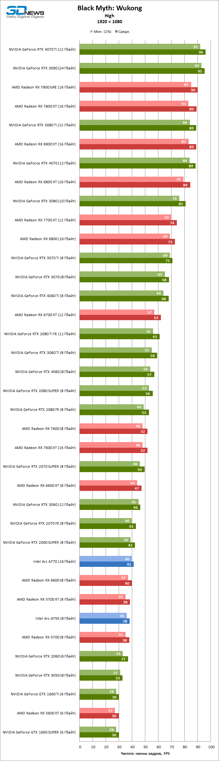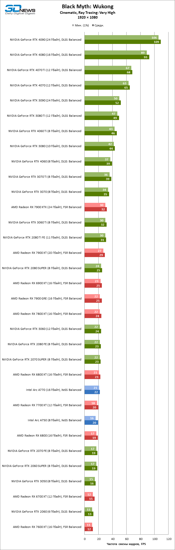 Por fim, com baixa qualidade de imagem, modelos baratos das gerações atual (GeForce RTX 4060 e Radeon RX 7600 XT) e anteriores (GeForce RTX 3060 e Radeon RX 6600), juntamente com a Radeon RX 5700 e a versão básica da GeForce RTX 2060 , atingiu uma taxa de quadros confortável a 60 FPS, a principal placa de vídeo da Intel, a Arc A770, foi finalmente lançada. Embora Black Myth: Wukong seja um jogo extremamente exigente em velocidade máxima, no modo “batata” o detalhe é reduzido tanto que placas de vídeo de baixo consumo de energia como a Radeon RX 5500 XT, Radeon RX 6500 XT e GeForce RTX 1650 SUPER atingiram a marca de 30 FPS. Os resultados da GeForce RTX 3050 e Intel Arc A750 tendem a 60 FPS, mas não ultrapassam a marca crítica.