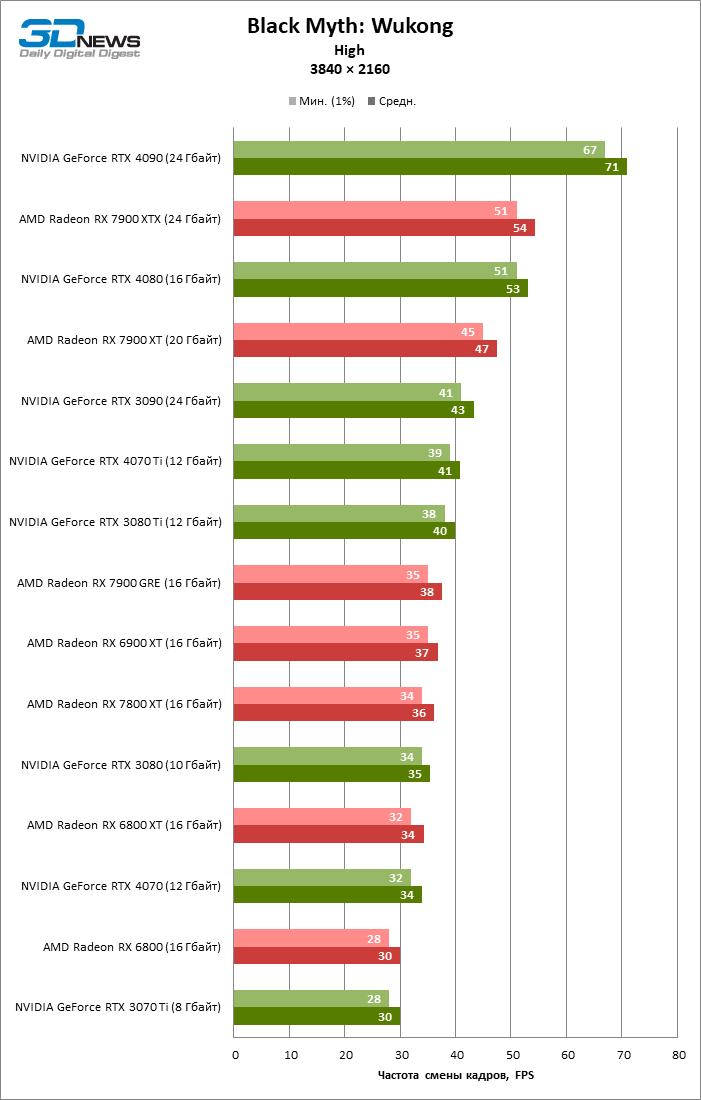Com alto detalhamento, taxas de quadros de 60 FPS e superiores foram demonstradas pelos modelos de alto desempenho da geração anterior (GeForce RTX 3080 e Radeon RX 6800 XT) e representantes correspondentes da linha atual (GeForce RTX 4070 e Radeon RX 7800 XT). A faixa de 30 a 60 FPS é aberta pela Radeon RX 7600, GeForce RTX 4060, Intel Arc A770, bem como por uma série de placas de vídeo formalmente desatualizadas: Radeon RX 6600 XT, GeForce RTX 2070 e a versão básica da GeForce RTX 3060.
