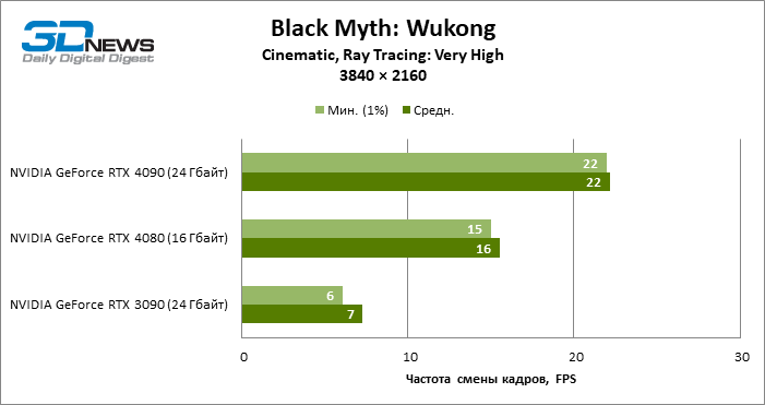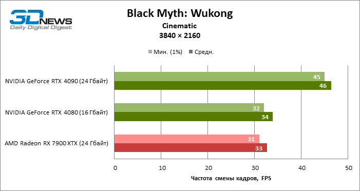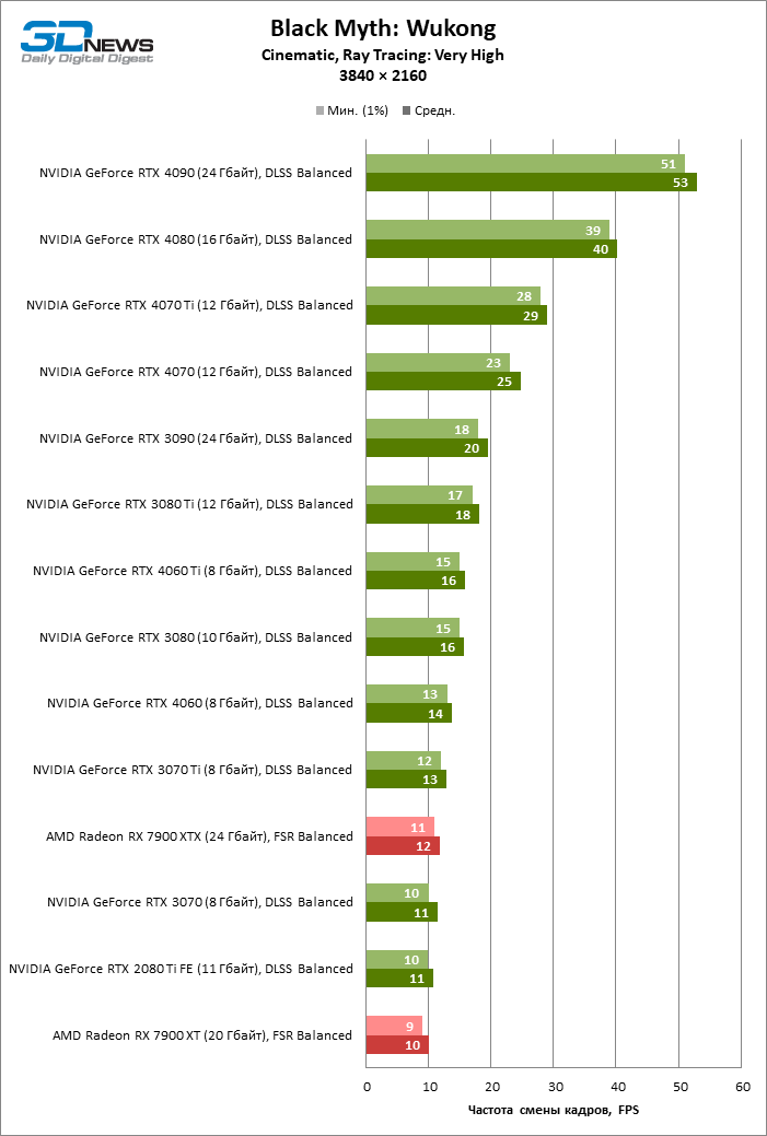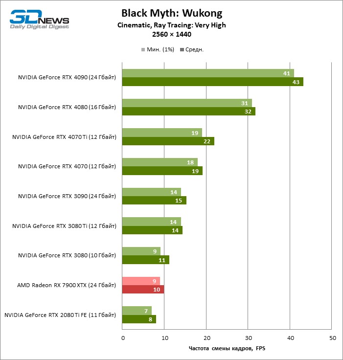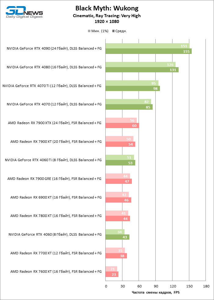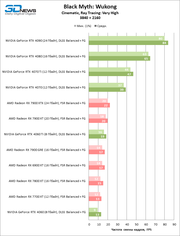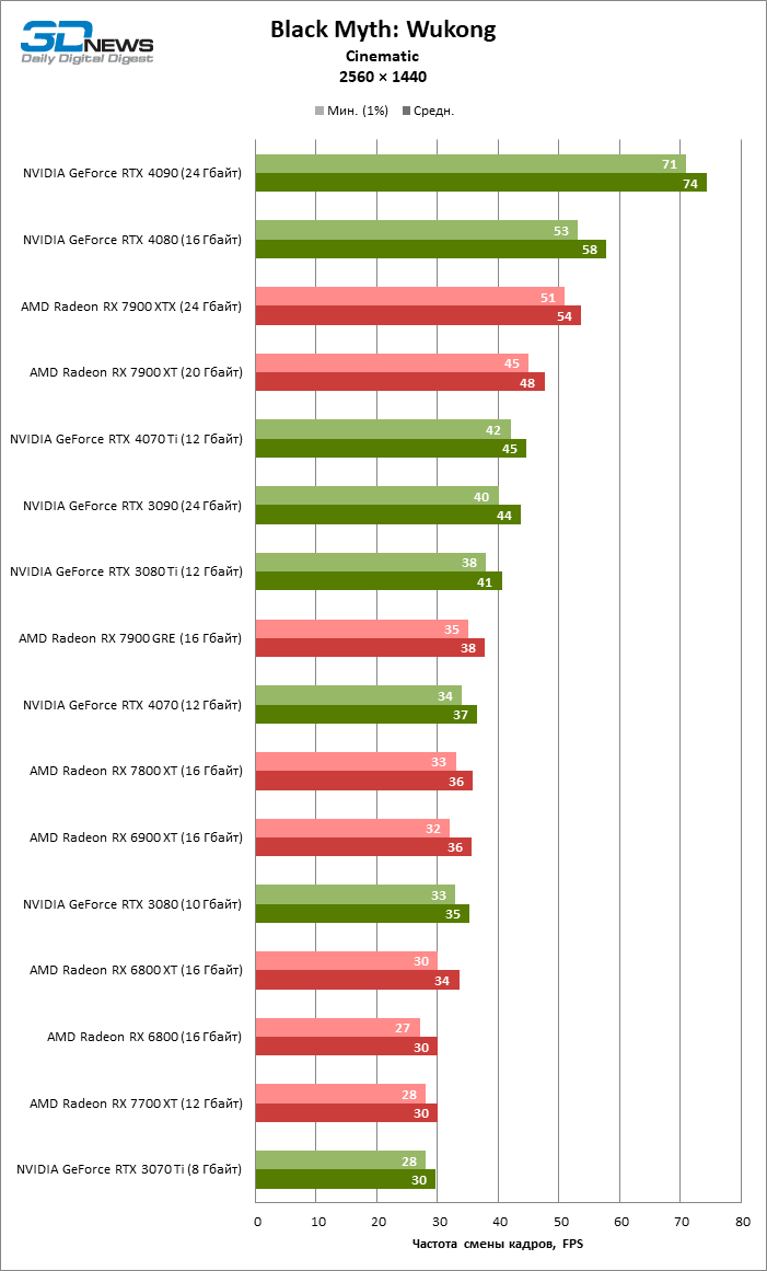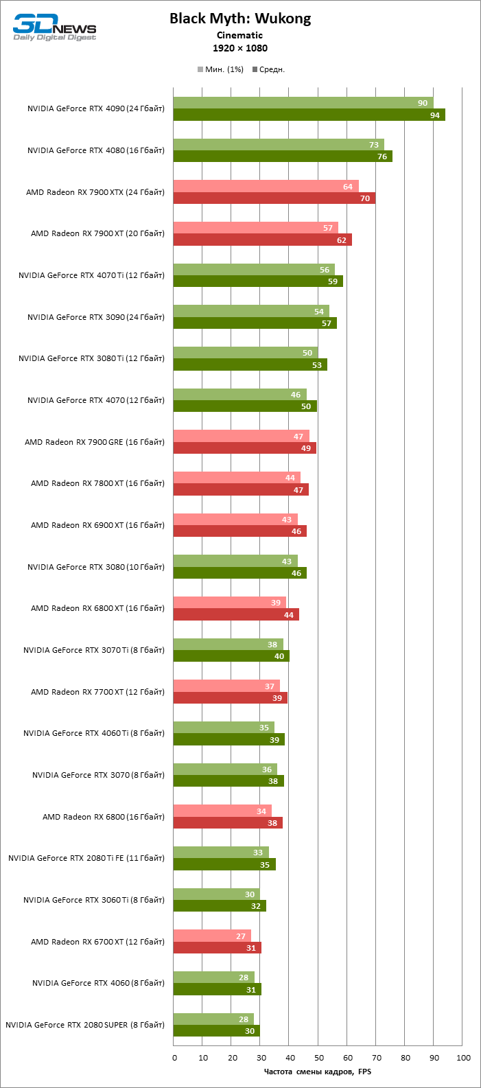Deixando de lado o rastreamento de caminho, as recomendações de hardware são menos diretas, mas Black Myth: Wukong continua sendo um jogo extremamente exigente, se não o mais exigente dos títulos AAA modernos. Quando rasterizados, o desempenho dos aceleradores “vermelhos” em comparação com seus concorrentes “verdes” acabou sendo inferior às estimativas habituais, e ainda assim a Radeon RX 7900 XT e RX 7900 XTX, junto com a GeForce RTX 4080 e RTX 4090, fornecem uma taxa de quadros de pelo menos 60 FPS na velocidade máxima. No modo 1440p, as principais Radeon RX 7900 XTX e GeForce RTX 4080 se aproximaram de 60 FPS, mas em 4K mesmo a GeForce RTX 4090 não atingiu a linha de chegada.