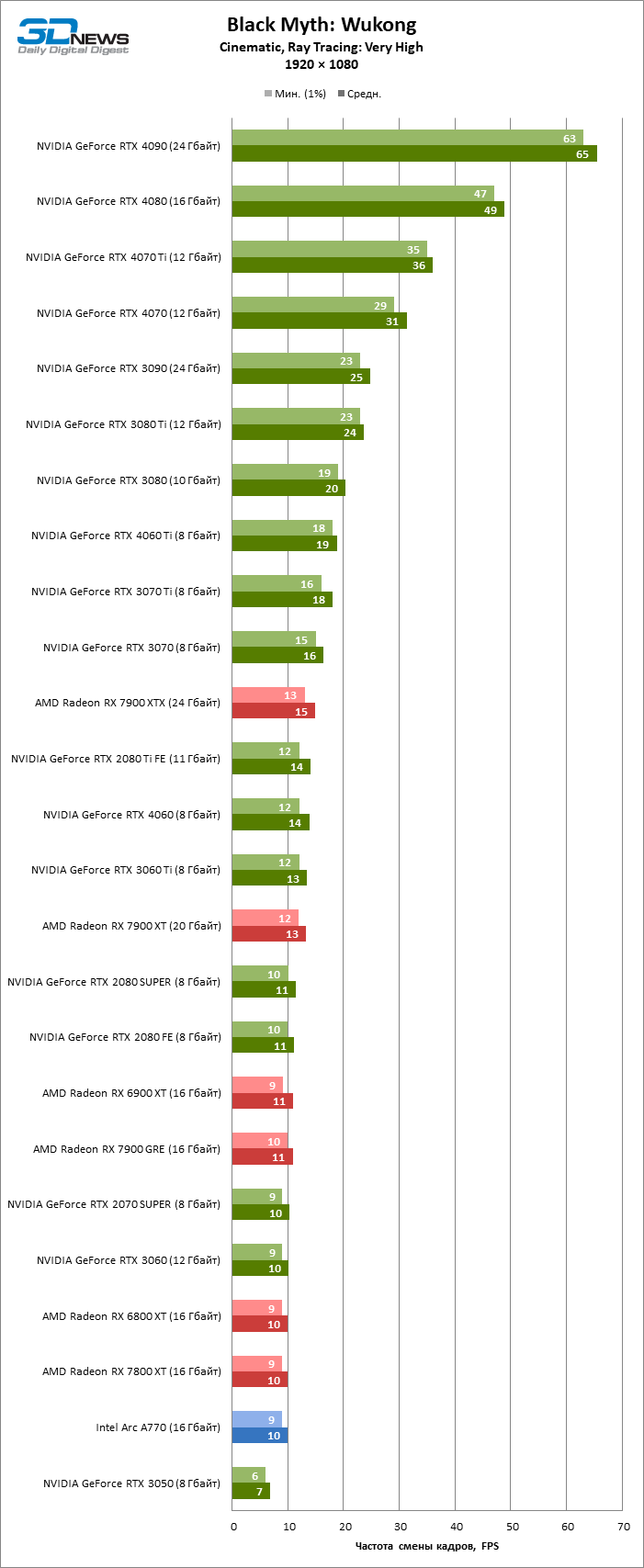 Já na resolução de 1080p, apenas quatro participantes do teste terminaram o benchmark Black Myth: Wukong com uma taxa de quadros média de pelo menos 60 FPS com qualidade de imagem máxima (excluindo ray tracing): Radeon RX 7900 XT e XTX, GeForce RTX 4080 e GeForce RTX 4090 A lista de dispositivos na faixa de 30 a 60 FPS é muito mais ampla: o desempenho mínimo é fornecido pela Radeon RX 6600 XT, Radeon RX 7700 XT, GeForce RTX 2080 SUPER, GeForce RTX 3060 Ti e pela versão básica da GeForce RTX. 4060. Nenhum dos modelos Intel Arc, incluindo o A770 com 16 GB VRAM, conseguiu superar o limite de 30 FPS na velocidade máxima.