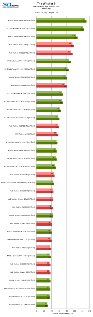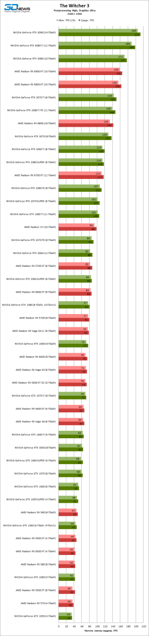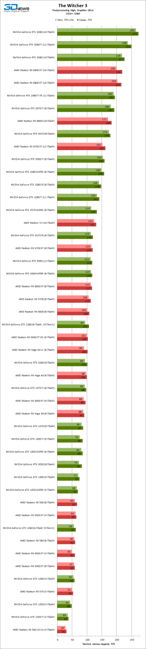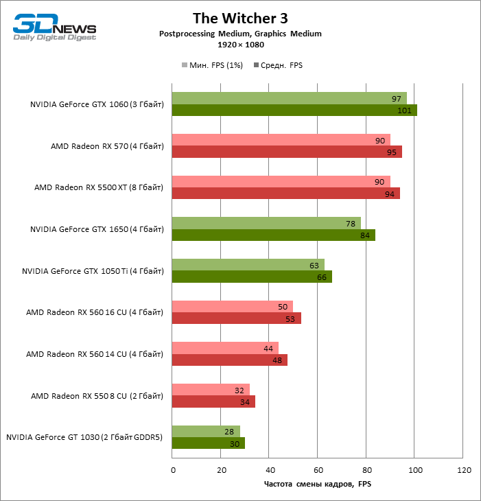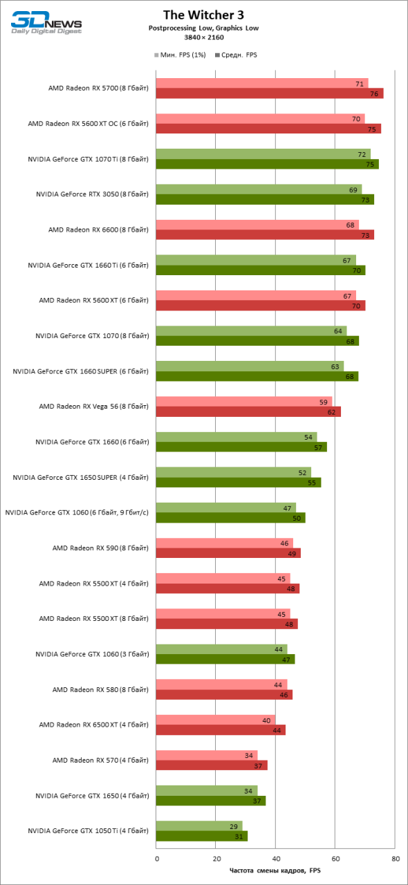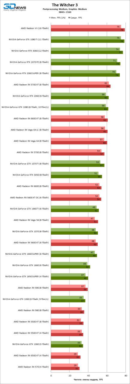 Os primeiros testes mostraram que The Witcher 3 – outrora um jogo muito exigente – não apresenta nenhuma dificuldade para hardware moderno. Mesmo dispositivos tão novos quanto a GeForce GTX 1060 e Radeon RX 580 atingem taxas de quadros superiores a 60 FPS em resolução de 1080p e configurações gráficas altas. Resultados semelhantes são mostrados pelas ofertas de orçamento da próxima geração – GeForce GTX 1650 SUPER e Radeon RX 5500 XT. A nova Radeon RX 6500 XT e, claro, aceleradores cada vez mais poderosos da linha atual da NVIDIA e AMD têm desempenho suficiente. A taxa de quadros mínima aceitável foi demonstrada pela GeForce GTX 1050 Ti e Radeon RX 560 (em uma configuração com 16 CU).