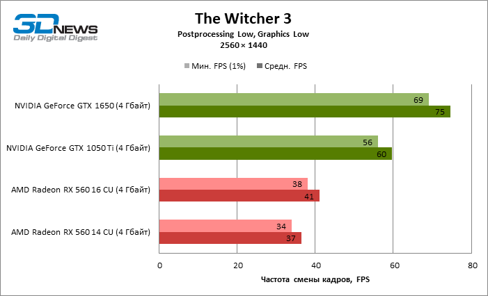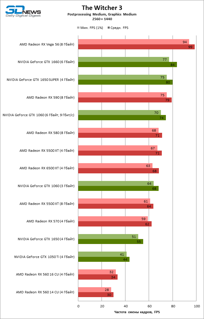 As solicitações para The Witcher 3 em configurações gráficas médias no modo 1440p, com base em uma taxa de quadros de 60 FPS, não foram muito maiores do que no modo 1080p. As taxas de quadros alvo estão sendo desenvolvidas pela Radeon RX 570, Radeon RX 5500 XT, GeForce GTX 1060 de 3 GB, GeForce GTX 1650 SUPER e a nova Radeon RX 6500 XT. Por sua vez, dispositivos como a Radeon RX 560 (qualquer configuração), a GeForce GTX 1050 Ti e a modificação básica da GeForce GTX 1650 garantem pelo menos 30 FPS.