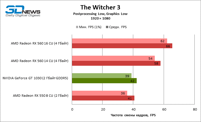 Apenas quatro dispositivos exigiram que a qualidade gráfica fosse reduzida ao mínimo, o que permitiu que a GeForce GT 1030 e Radeon RX 550 atingissem uma taxa de quadros de 40 FPS, enquanto o desempenho da Radeon RX 560 girava em torno de 60 FPS: um pouco menos para o RX 560 com uma configuração de GPU simplificada e superior para o RX 560 com 16 CU.