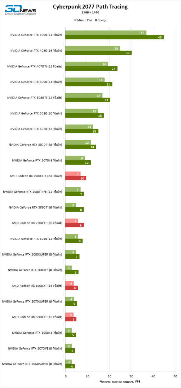 No que diz respeito aos produtos AMD, eles não estão mais tão atrás de seus concorrentes “verdes” em ray tracing, mas o full path tracing não é o mesmo que a renderização híbrida familiar de muitos outros jogos. Como resultado, até mesmo a principal Radeon RX 7900 XTX caiu para o nível da GeForce RTX 2080 Ti, duas gerações de placas de vídeo NVIDIA mais antigas. E a AMD ainda não possui um método de upscaling de alta qualidade como o DLSS para fornecer um aumento na taxa de quadros devido a grandes fatores de dimensionamento sem danos tangíveis à qualidade da imagem.