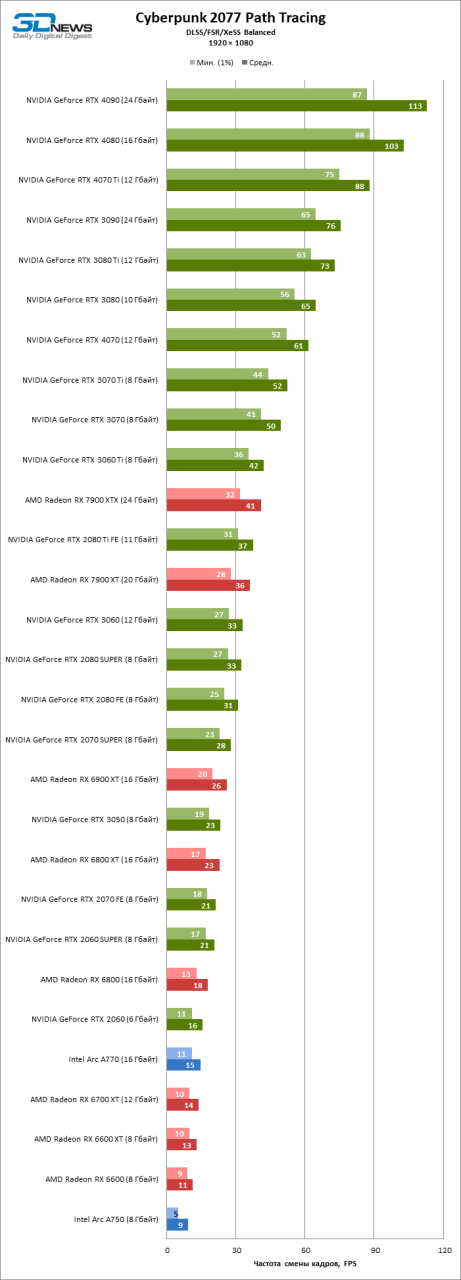 Obviamente, no Cyberpunk 2077 com rastreamento de caminho, alguma forma de upscaling é necessária para quase todas as placas de vídeo modernas. Felizmente, este jogo pode oferecer o método de dimensionamento de quadro mais adequado para qualquer uma das GPUs modernas: DLSS 3.0 para dispositivos NVIDIA, FSR 2.1 para AMD e XeSS para aceleradores Intel. Os participantes da comparação foram testados novamente – cada um usando tecnologia nativa – com a configuração de upscaling balanceada, que fornece uma proporção de cerca de 1,7 em cada lado entre o tamanho dos quadros original e final.
