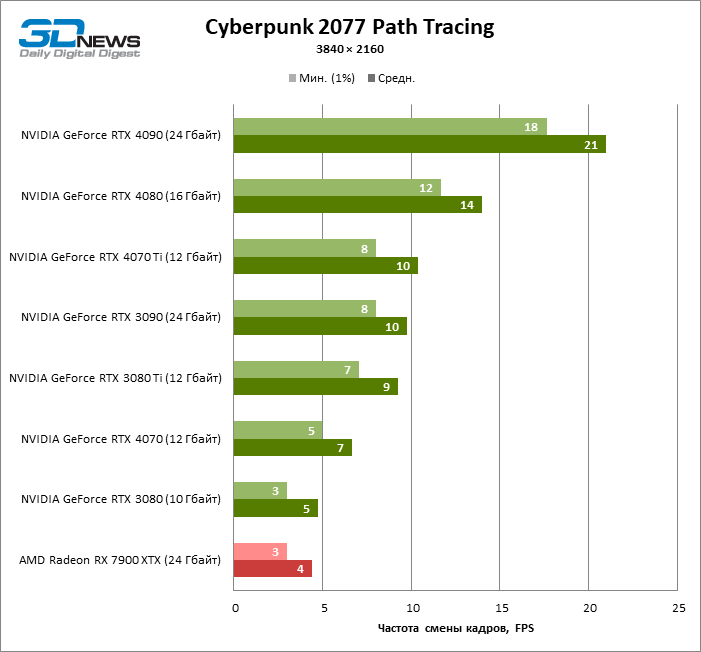 Como você pode esperar, apenas um punhado das GPUs de maior desempenho conseguiu completar o benchmark em resolução 4K em um período de tempo razoável, muito menos ser capaz de jogar normalmente. A GeForce RTX 4090 parou em 21 FPS e a GeForce RTX 3090 – 10. De todos os modelos “vermelhos”, um entrou no gráfico – a Radeon RX 7900 XTX com resultado de 4 FPS, e a GeForce RTX 3080 foi apenas 1 FPS mais rápido.