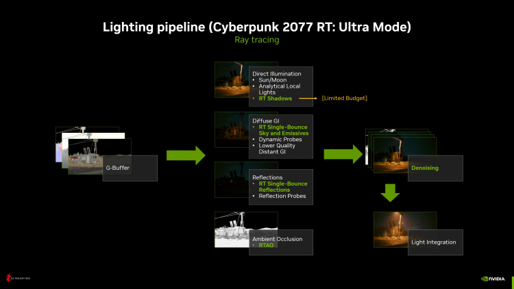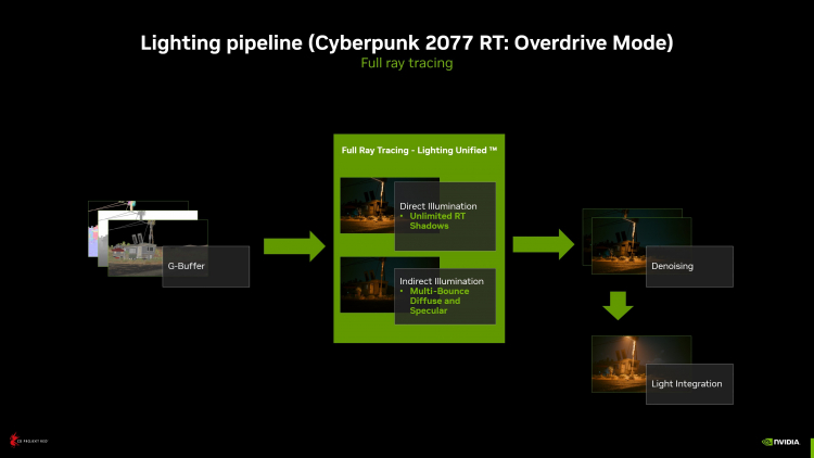 A CD Projekt RED transformou Cyberpunk 2077 em um campo de testes para novas tecnologias. Na época do lançamento, o jogo já apresentava um modelo avançado de rastreamento de raios que cobre três aspectos principais da imagem: iluminação global (ou seja, indireta), reflexos e sombras. No entanto, como outros mecanismos híbridos, o RED Engine envolve o rastreamento de raios em operações isoladas, enquanto a maior parte da renderização ainda é feita por rasterização. O recente patch 1.62 oferece uma alternativa a essa abordagem obviamente comprometida na forma de uma simulação de iluminação totalmente rastreada.