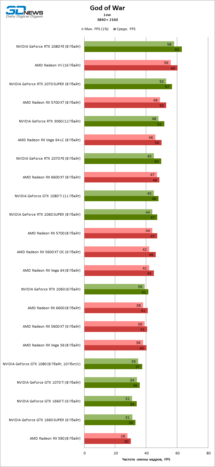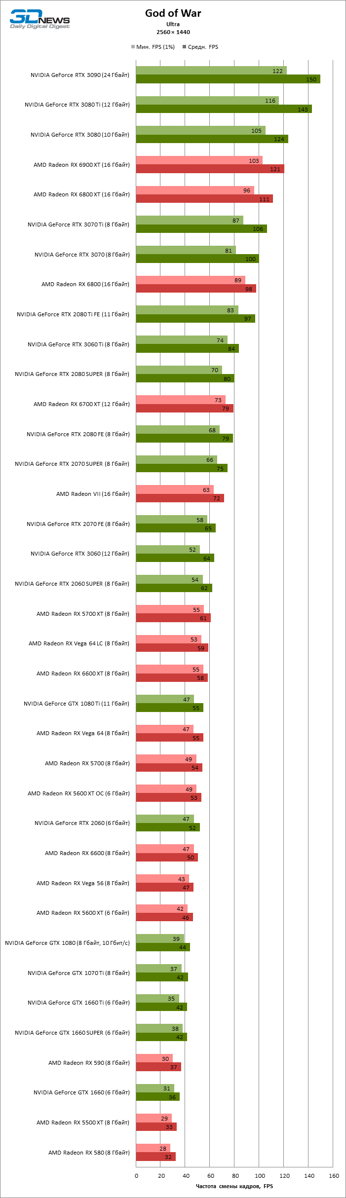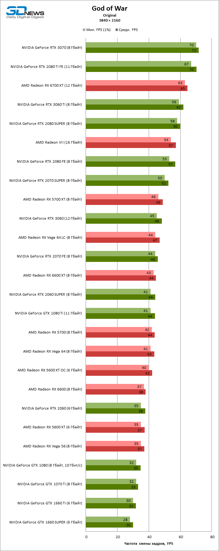 Com qualidade de imagem “original” média, taxas de quadros de 60 FPS em God of War são garantidas por placas de vídeo modernas da categoria de desempenho médio-alto – Radeon RX 6700 XT e GeForce RTX 3060 Ti – além de modelos top da 20ª Série GeForce: RTX 2080 SUPER e RTX 2080 Ti. Por sua vez, 30 FPS podem fornecer aos modelos uma ou duas etapas de intervalo de modelo abaixo dos dispositivos que passaram no teste em velocidades máximas. Aqui o limite passa pelos resultados da Radeon RX Vega 56, Radeon RX 5600 XT sem overclock de fábrica, GeForce GTX 1070 Ti e GeForce GTX 1660 SUPER.