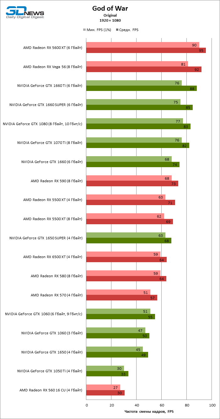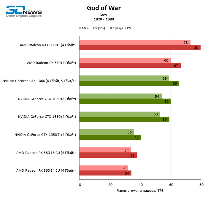 Modelos raros entre as 45 placas de vídeo de teste são forçados a reduzir a qualidade gráfica ao mínimo (o que, aliás, não afeta tanto o desempenho), mas se chegar a isso, o caminho para uma taxa de quadros de 60 FPS se abre up para dispositivos como a Radeon RX 570, Radeon RX 6500 XT e 3 GB GeForce GTX 1060. Os requisitos mínimos do sistema de God of War com a expectativa de uma taxa de quadros de pelo menos 30 FPS com baixa qualidade gráfica são atendidos pela Radeon RX 560, GeForce GTX 1050 Ti e o modelo básico GeForce GTX 1650.