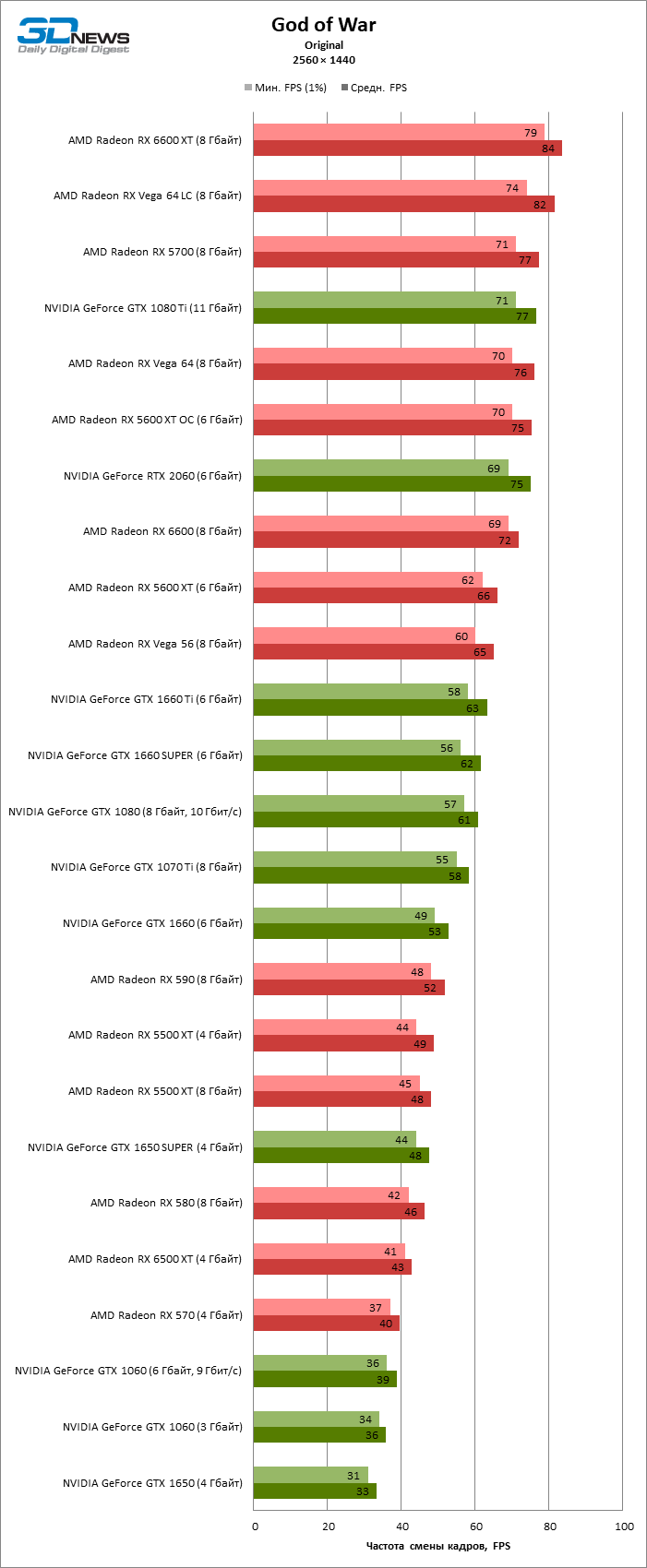 Desde os primeiros testes de God of War, fica claro que este é um daqueles raros jogos que combinam excelentes gráficos com requisitos de sistema moderados. Claro, 1080p não é considerado alta resolução hoje, mas a maioria dos jogadores ainda está sentado em tais monitores e ficará feliz em saber que eles podem obter uma taxa de quadros acima de 60 FPS com configurações máximas de qualidade de imagem na GeForce RTX 2060 e Radeon RX 5600 XT hardware de nível, e também modelos mais antigos começando com Radeon RX Vega 64 e GeForce GTX 1080 Ti. E, claro, qualquer placa de vídeo de nova geração irá lidar com essa tarefa, com exceção da nova Radeon RX 6500 XT. Mais tarde divulgaremos uma análise da novidade, mas por enquanto parece que esta é, na melhor das hipóteses, um substituto para a popular Radeon RX 580 do passado, apenas com metade da quantidade de memória local, que em God of War não permite que a Radeon RX 6500 XT mantenha uma taxa de quadros aceitável com o máximo de detalhes. Até a Radeon RX 5500 XT obteve melhores resultados neste jogo, mas não vamos tirar conclusões precipitadas até coletarmos dados para uma análise completa.