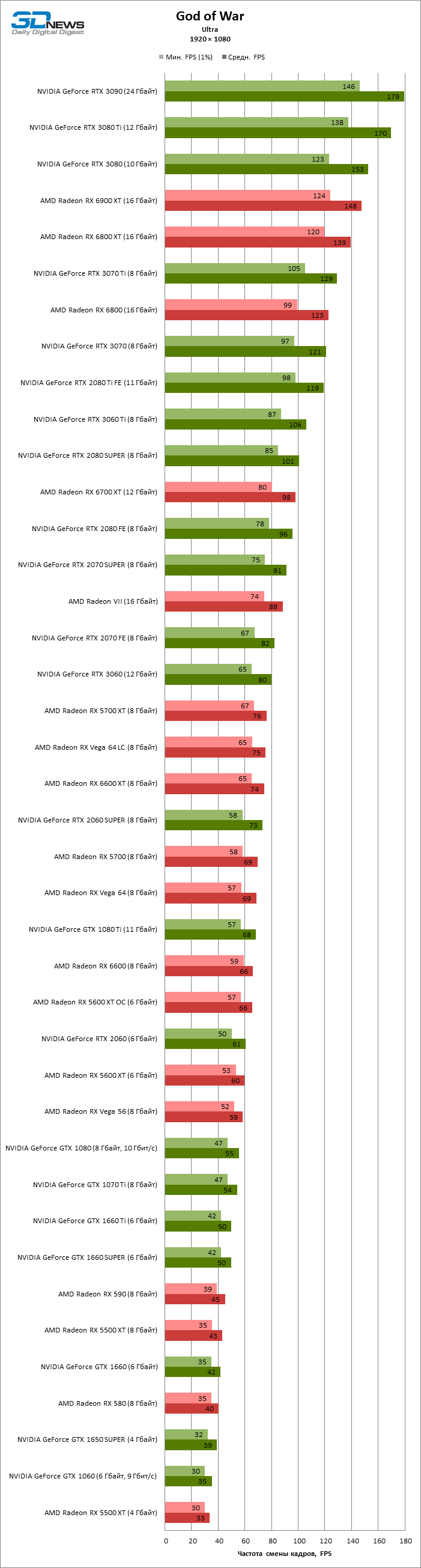 É bom ver que entre os títulos de jogos dos últimos anos, não, não, e há exemplos de excelente otimização do motor gráfico. Nas configurações de renderização máxima, que é uma atualização do lançamento do console de 2018, God of War parece muito moderno e, ao mesmo tempo, não requer mais desempenho do que as placas gráficas comuns de gama média podem oferecer – Radeon RX 5700 XT, GeForce RTX 2060 SUPER ou mais modelos novos, desde Radeon RX 6600 até GeForce RTX 3060 Ti. Além das capacidades de tais dispositivos está apenas o jogo em uma tela 4K, que requer um acelerador como o Radeon RX 6800 ou GeForce RTX 3070 Ti. As configurações máximas não se tornaram um obstáculo para os modelos top duas gerações mais velhos – GeForce RTX 1080 Ti e Radeon RX Vega 64, no entanto, apenas no modo 1080p “pessoal”.