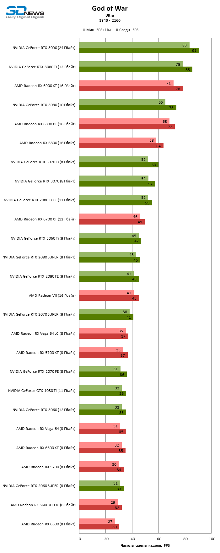 Títulos modernos, e God of War não é exceção, precisam de hardware poderoso para jogar no modo 4K com taxa de quadros de 60 FPS e configurações de detalhes máximas: pelo menos a Radeon RX 6800, GeForce RTX 3070 Ti ou representantes mais antigos das linhas correspondentes. No entanto, se por uma questão de alta definição um jogador estiver pronto para suportar uma taxa de quadros acima de 30, mas abaixo de 60 FPS, uma lista bastante ampla de dispositivos pode suportar God of War nas configurações máximas, começando com a GeForce RTX 2060 SUPER, Radeon RX 5600 XT com overclocking típico de fábrica, GeForce GTX 1080 Ti e Radeon RX Vega 64. Radeon RX 6600 e GeForce RTX 3060 podem fazer o mesmo.