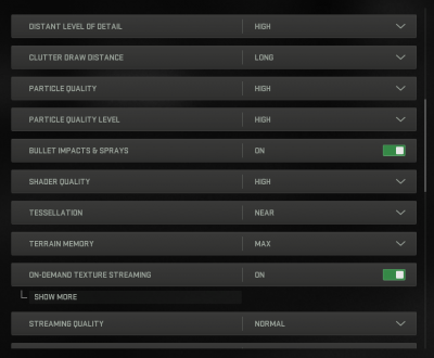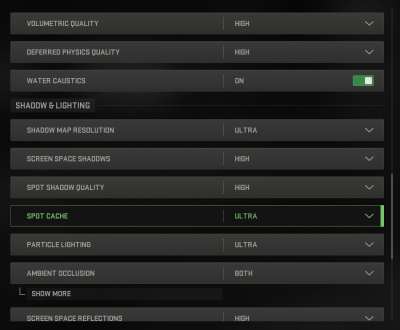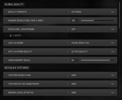 A interface do CoD: MW II está repleta de outras configurações gráficas – o jogo permite uma personalização muito flexível para um ou outro hardware, mas a maioria dos parâmetros está sujeita a um controle detalhado comum de cinco etapas. Para testar as placas de vídeo, escolhemos o modo de qualidade máxima, o modo intermediário “balanceado” e, por fim, o “mínimo”. Mas observe que, por padrão, as configurações mínimas incluem uma resolução reduzida em 50% (sem qualquer upscaling inteligente) – recusamos essa opção.