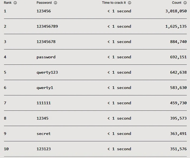Detentor do recorde mundial de senhas, a string “123456” foi encontrada em mais de 3 milhões de contas. Leva menos de um segundo para quebrar essa senha, assim como a maioria das outras da lista. O segundo e terceiro lugares foram ocupados por “123456789” e “12345678” respetivamente. Algumas das senhas incluídas na lista demoram mais para serem quebradas – pode levar minutos, horas ou até dias. Por exemplo, “g_czechout” está classificado em 157º e levará 12 dias para ser quebrado.