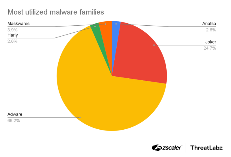 O pesquisador da Zscaler, Himanshu Sharma, observou que a equipe do ThreatLabz observou um aumento acentuado no número de aplicativos de adware no Google Play em meio à atividade de ameaças como Joker, Harly e trojans bancários, enquanto o número de malware como Facestealer e Coper diminuiu.