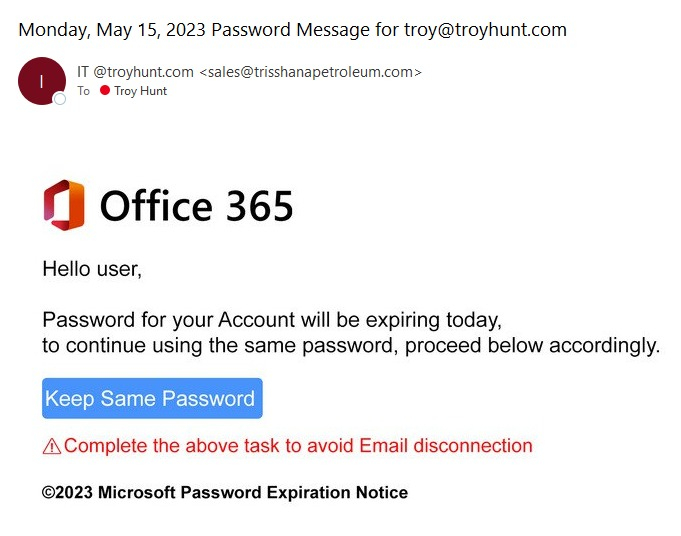 “Troy Hunt, especialista em segurança cibernética, ficou conhecido por ser um dos primeiros a soar o alarme quando twittou sobre uma nova campanha de phishing. Segundo ele, os invasores estão usando o método antigo e testado de envio de e-mails em nome de um empresa legítima.”