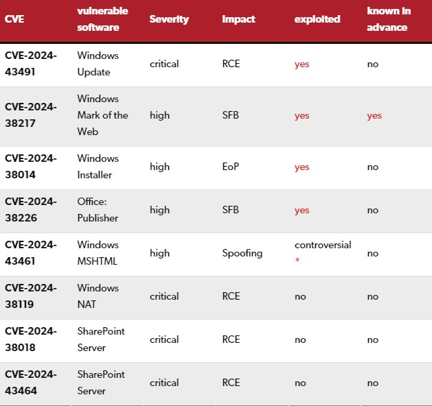 A tabela abaixo destaca as vulnerabilidades de segurança mais perigosas no relatório Patch Day da Microsoft de setembro de 2024. Nota: RCE: Remote Code Execution – execução remota de código; EoP: Elevação de Privilégios – aumento de privilégios de acesso; SFB: Security Feature Bypass – ignora funções de segurança. As vulnerabilidades que já estão sendo exploradas em condições reais estão marcadas em vermelho na tabela.