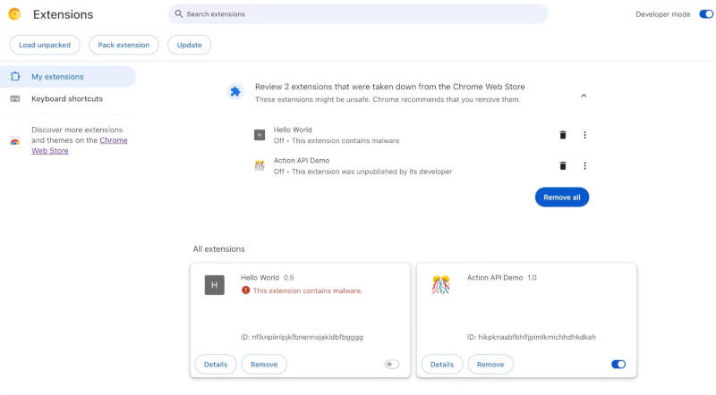 As extensões são uma ótima maneira de estender os recursos de um navegador, mas também uma ferramenta que às vezes é abusada por hackers: algumas extensões roubam senhas e exibem anúncios para os usuários. Na tentativa de proteger os usuários deles, o Google está constantemente removendo malware da loja, mas isso dificilmente ajuda quem já os instalou – esses usuários precisam removê-los sozinhos. Às vezes isso também não acontece – as pessoas simplesmente ignoram as notícias sobre extensões perigosas.