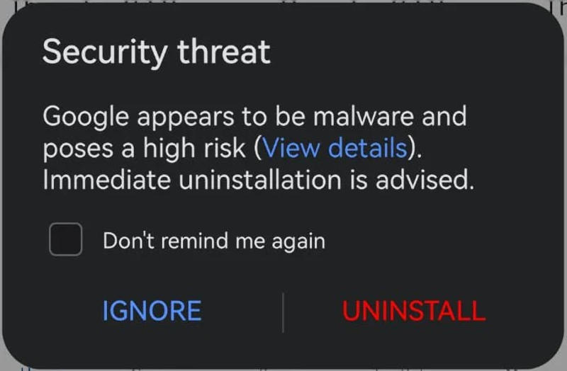 Quando os usuários clicam no botão “Ver detalhes” no alerta, o sistema diz: “Descobriu-se que este aplicativo envia SMS secretamente, força os usuários a pagar por conteúdo adulto, baixa/instala aplicativos secretamente ou rouba informações pessoais, o que pode resultar em perda de propriedade e vazamento de dados pessoais.” Portanto, os usuários são aconselhados a desinstalar este aplicativo.