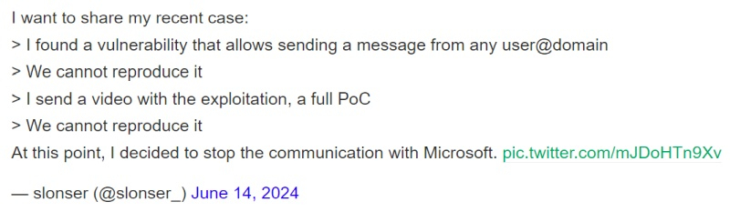 Kokorin contatou a Microsoft pela última vez em 15 de junho. Mais tarde, ele disse: “A Microsoft pode ter notado meu tweet porque, algumas horas atrás, eles reabriram [sic] um dos meus relatórios que enviei há alguns meses”. “Muita gente me entende mal e pensa que quero dinheiro ou algo parecido”, acrescentou o pesquisador. “Eu realmente só quero que as empresas não ignorem os pesquisadores e sejam mais amigáveis quando você tentar ajudá-los.”