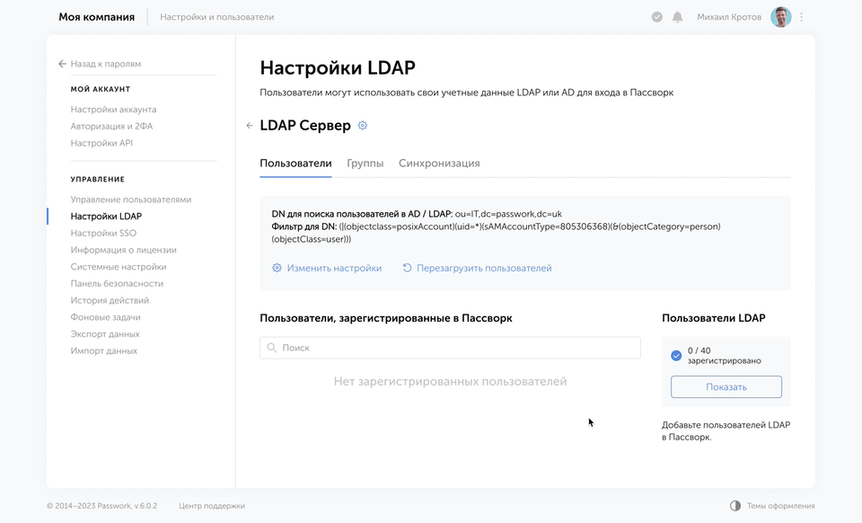 Com o lançamento do Passwork 6.0, os desenvolvedores redesenharam a interface de configurações do LDAP e adicionaram novos recursos. Agora, uma janela separada é usada para adicionar novas contas, e os próprios usuários definem uma senha mestra quando fazem login no sistema pela primeira vez. Além disso, ele implementa uma atualização em segundo plano dos dados do usuário do LDAP e adiciona tags especiais para grupos remotos e grupos associados a funções. Tudo isso simplificou muito o trabalho do administrador.