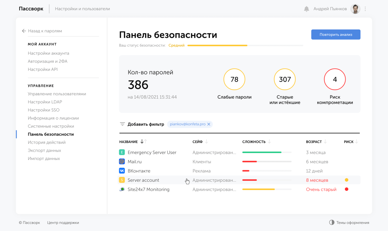 As ferramentas de auditoria de segurança integradas no Passwork permitem que você analise as senhas usadas pelo pessoal e receba alertas oportunos sobre senhas antigas, fracas e comprometidas