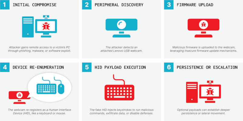 No caso da BadCam, um invasor pode instalar um firmware alternativo em uma webcam Lenovo vulnerável com Linux e transformá-la em um dispositivo malicioso. A câmera continuará executando suas funções básicas sem levantar suspeitas por parte do usuário, mas também ganhará novos recursos perigosos. Ela poderá emular dispositivos USB adicionais, como um teclado, o que dará aos hackers a capacidade de inserir comandos, assumir o controle do computador, inserir código malicioso ou usar a câmera como um trampolim para uma penetração mais profunda no sistema.