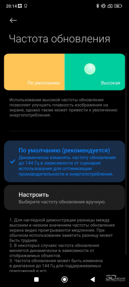 Ao mesmo tempo, a taxa de atualização aumentou para 144 Hz. Você mesmo pode escolher a frequência (60 ou 144 Hz, sem valores intermediários), ou deixar a escolha para seu smartphone. No entanto, a frequência atinge o máximo raramente, apenas em algumas aplicações; Mesmo na tela principal ou em aplicações básicas a frequência não passa de 120 hertz. Em jogos, muitas vezes é mais alto que o padrão, mas novamente não consegui gravar 144 hertz. De qualquer forma, isso é melhor do que na maioria dos smartphones modernos, onde frequências aumentadas, via de regra, não são suportadas em jogos. Também acima da média está a frequência da modulação por largura de pulso (PWM) – 2880 Hz. Mesmo o DC Dimming não é necessário; essencialmente não há problemas visuais com cintilação. O resto da matriz também é de alta qualidade: as cores não são distorcidas mesmo com um desvio extremo da visão da perpendicular, e o contraste permanece quase inalterado. O revestimento oleofóbico é eficaz e as impressões digitais são facilmente apagadas da tela.