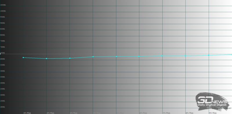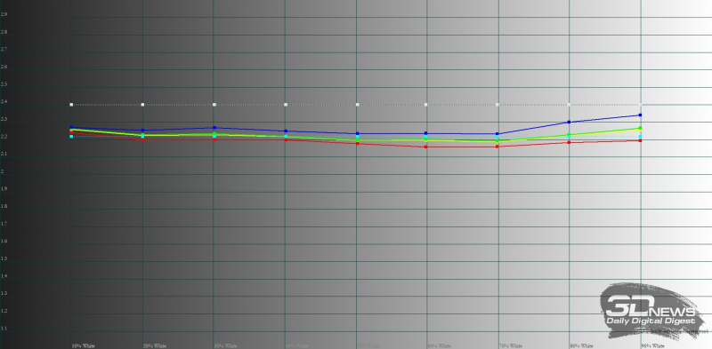 O padrão é o modo brilhante. Nele vemos uma gama de cores expandida que atende ao padrão DCI-P3, a gama correta em tons de cinza (2,26 com curvas corretas), mas uma temperatura de cor ligeiramente aumentada (cerca de 7.000-7.100 K com uma norma de 6.500 K ). O desvio médio DeltaE na escala Color Checker, que inclui uma ampla gama de cores e tons de cinza, foi de 3,13 com padrão 3. O resultado é muito bom, embora não seja uma referência
