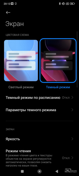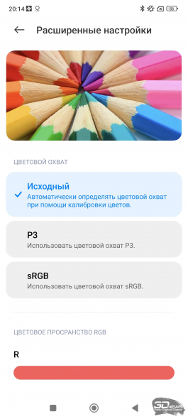 O conjunto de configurações disponíveis é típico de smartphones mais antigos no MIUI: você pode habilitar o modo de exibição de informações na tela bloqueada (Always-On Dislpay), com uma animação característica de sua escolha; Existe um modo de leitura especial com tom de tela quente, ajustes de fonte, modo escuro com capacidade de personalizá-lo, agendá-lo e selecioná-lo para aplicações específicas e parâmetros especiais para trabalhar com VR. É oferecido um sistema avançado de ajuste de cores: ajuste automático dependendo da iluminação, modos claro e saturado, bem como configurações avançadas onde você mesmo pode escolher o espaço de cores. Testei a tela do Xiaomi 13T Pro com as configurações “Vívido” (definido por padrão), “Padrão” e “Nativo” (o smartphone detecta automaticamente a gama de cores da imagem atual e ajusta a imagem).